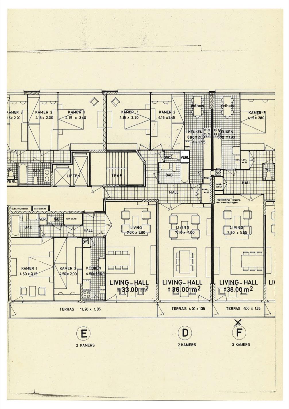 Indeling: hall, gastentoilet, 2 slaapkamers ene zijde, badkamer met bad, leefruimte met terras en topuitzicht (parket) andere zijde en via de hall naar de keuken.