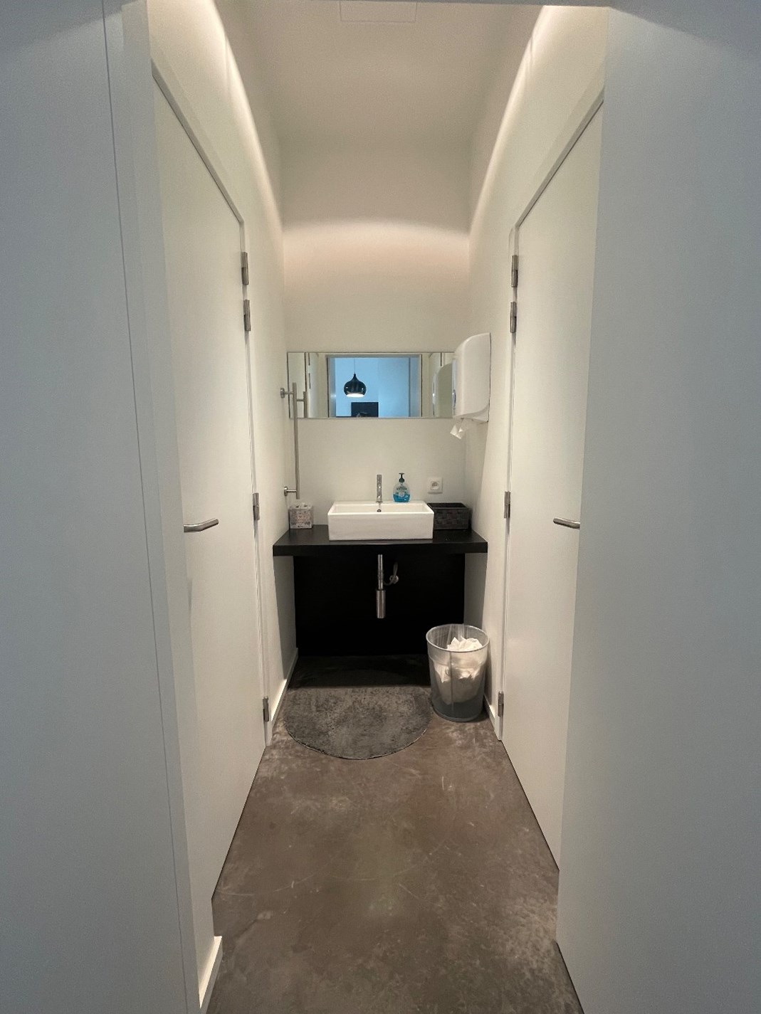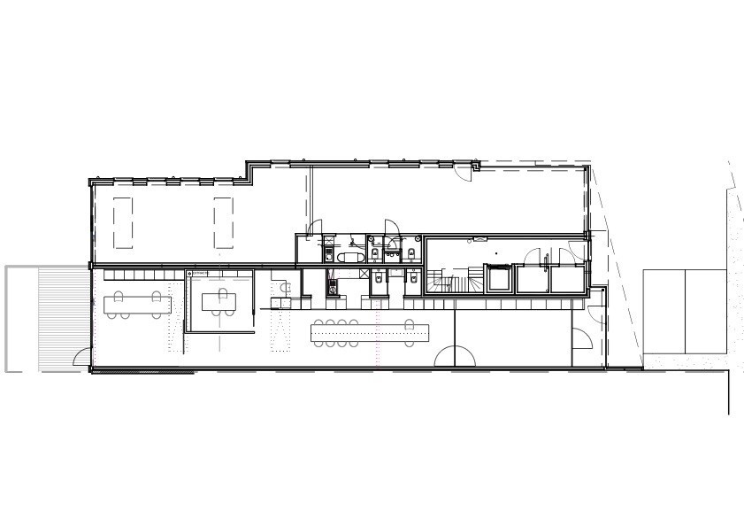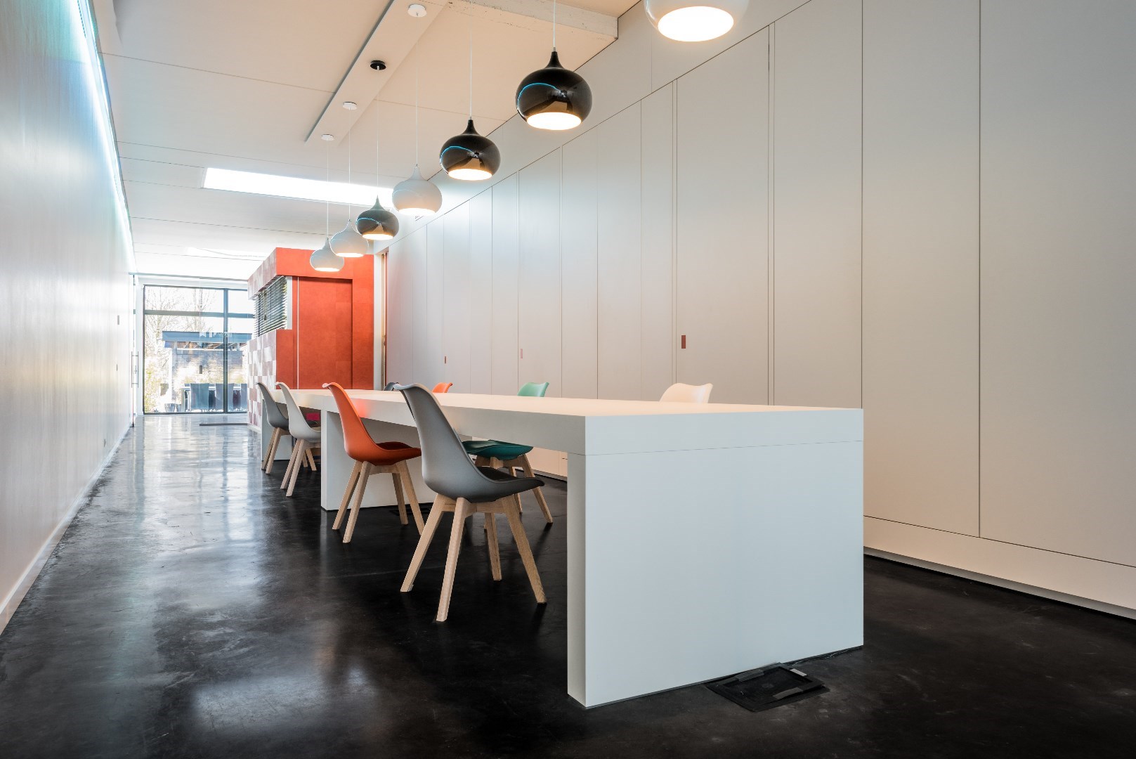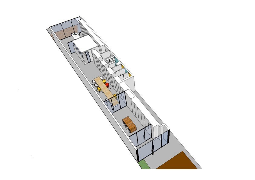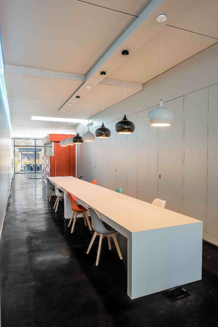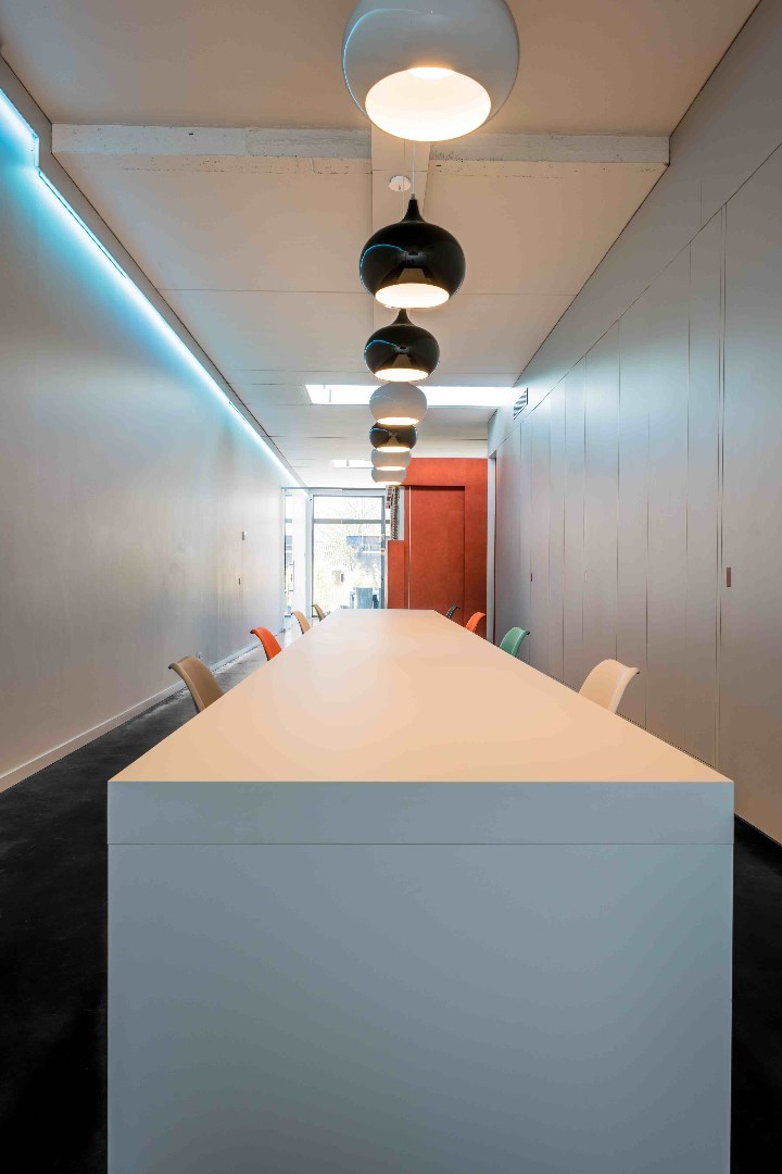 afgesloten inkomhal, eerste kantoorgedeelte dat afgesloten kan worden van het volgende gedeelte met de glazen wand. Die kan zowel doorzichtig als ondoorzichtig gemaakt worden zodat privacy waar nodig kan gegarandeerd worden. Verder komt u in een mooie open lange ruimte waar een heel lange bureautafel/werkplek/vergaderplek is gecreëerd. Ideaal voor flexibel werken. Rechts achter de de wandkasten die op maat gemaakt zijn en die zich over de hele ruimte uitstrekken, bevinden zich de keuken, de 2 toiletten en een bergingsruimte en een kleinere aparte werkplek. Daarnaast is ook nog een private kantoorruimte gecreëerd achter de oranje-rode wand/deur.