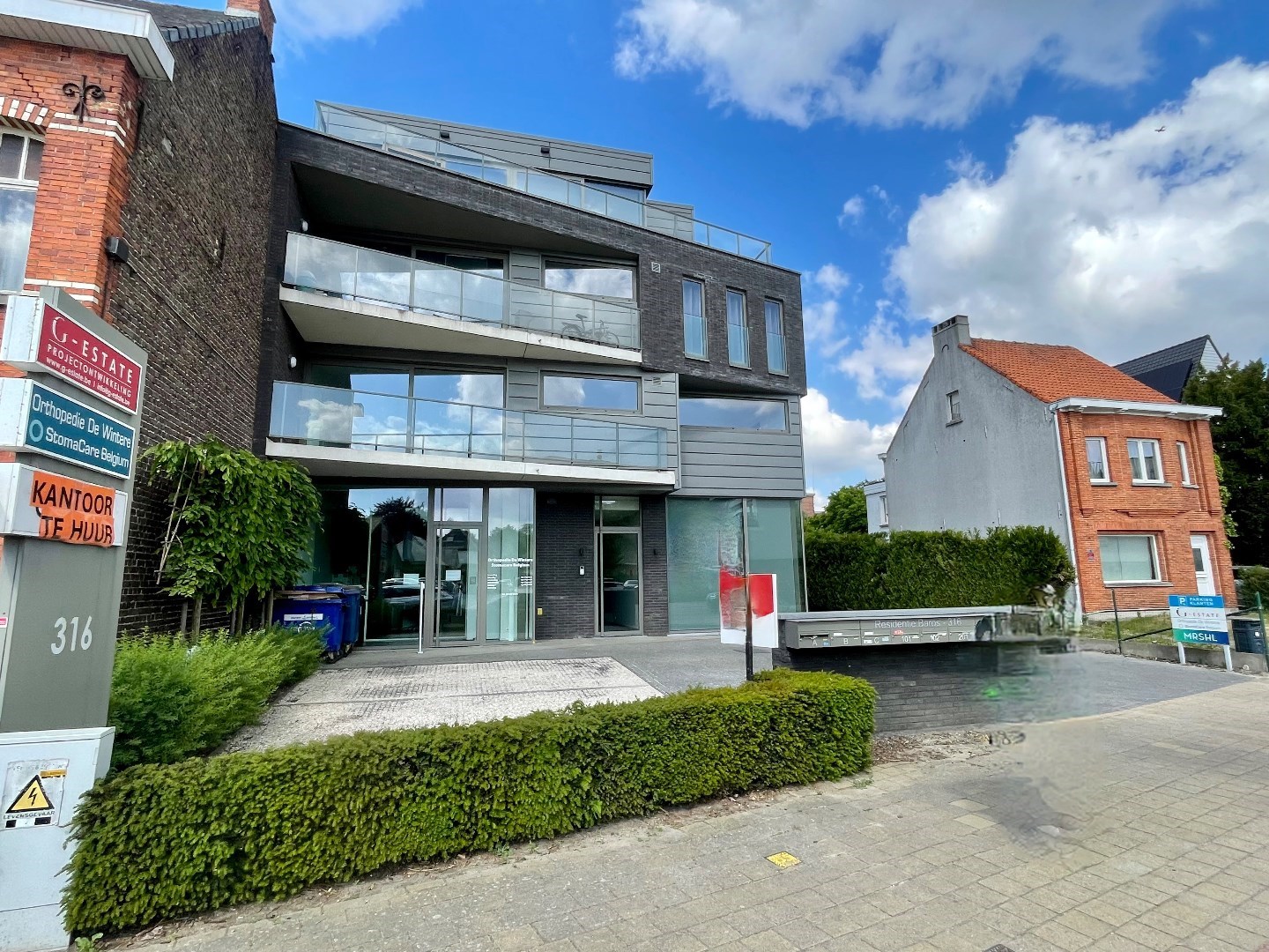 Het gebouw is gelegen in een stedelijke omgeving van Merelbeke (Flora), net voor de brug van Gent komende, direct aan de opritten en afritten van de R4 en E40/E17. En ligt op fietsafstand van Gent centrum en wandelafstand van het centrum van Merelbeke waar men over heel wat winkels/supermarkten/restaurants enz. beschikt. Daarnaast is het kantoor goed bereikbaar met het openbaar vervoer en beschikt het over een 5tal parkeerplaatsen achteraan het gebouw voor medewerkers en bezoekers. En 1 parkeerplaats vooraan. In die zone zit heel wat bedrijvigheid en heeft heel veel passage. Het is de ideale plek om een flexibel kantoor of (medische ) praktijkruimte uit te bouwen.