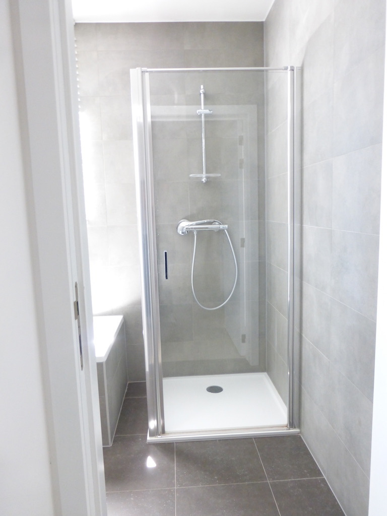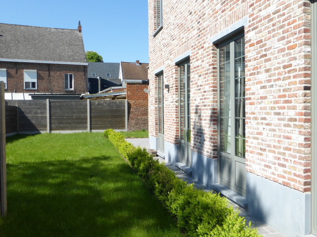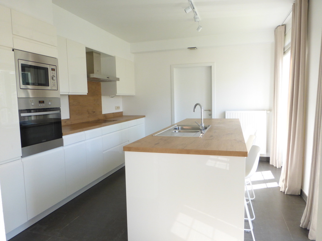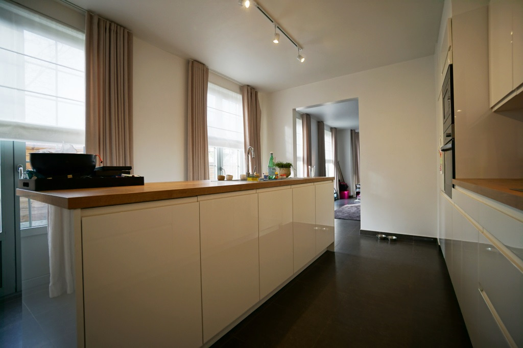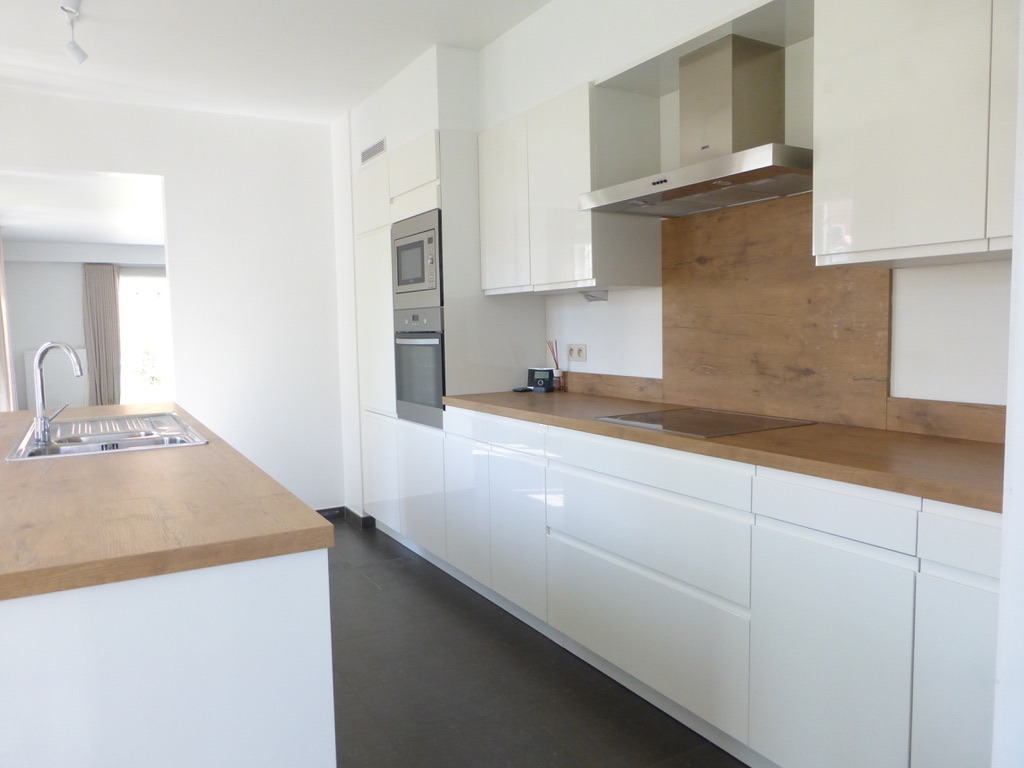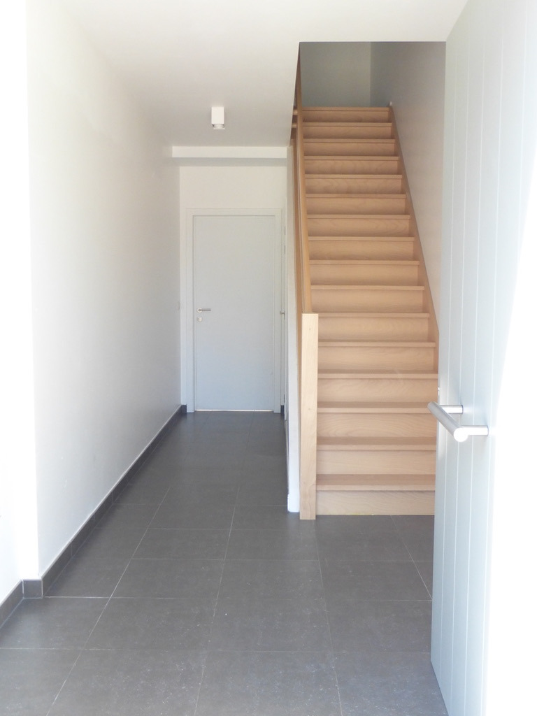 Indeling: grote inkomhall, gastentoilet, leefruimte met zicht op tuin en terras, moderne witte open keuken (volledig geïnstalleerd) ,wasberging,